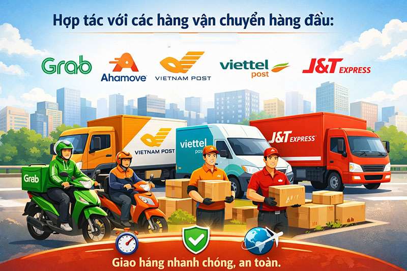 Hợp tác với các hãng vận chuyển hàng đầu: Chúng tôi làm việc với Grab, Ahamove, Vietnam Post, Viettel Post, Giao Hàng Nhanh, J&T Express để đảm bảo giao hàng nhanh chóng, an toàn.